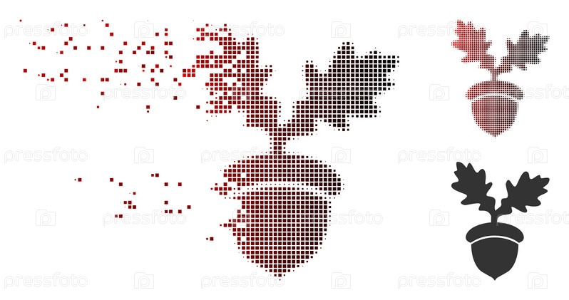 Икона векторного дуба в сломанном, пикселированном полутоне и неповрежденных целых вариантах. эффект исчезновения включает квадратные искры и горизонтальный градиент от красного к черному