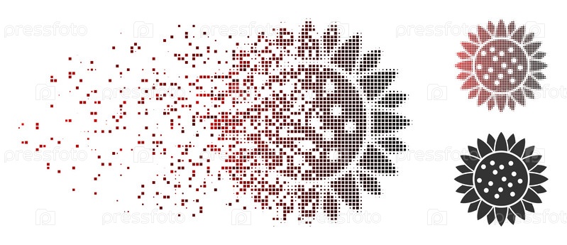 Икона векторного цветка подсолнечника в растворенном, пикселированном полутоне и неповрежденных твердых вариантах.Эффект распада использует квадратные искры и горизонтальный градиент от красного к черному