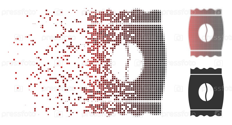 Векторный иконка упаковки кофейных бобов в сломанном, пунктированном полутоне и неповрежденной твердой версии.Эффект дезинтеграции использует прямоугольные точки и горизонтальный градиент от красного к черному