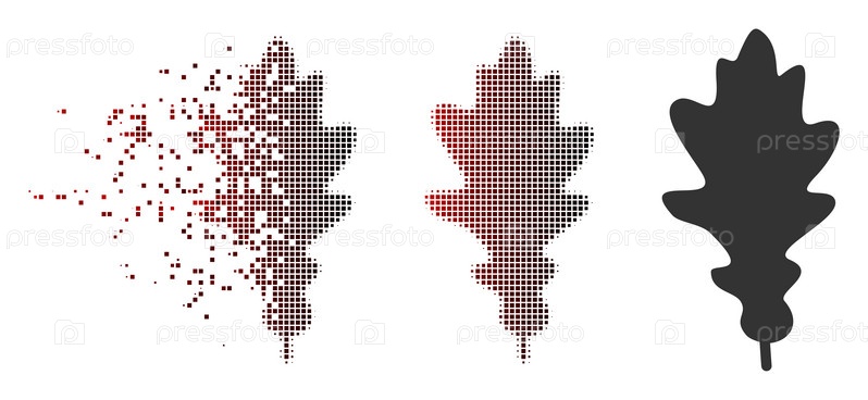 Векторная икона дубового листа в рассеянном, пикселированном полутоне и неповрежденных целых версиях.Эффект исчезновения включает прямоугольные искры и горизонтальный градиент от красного к черному