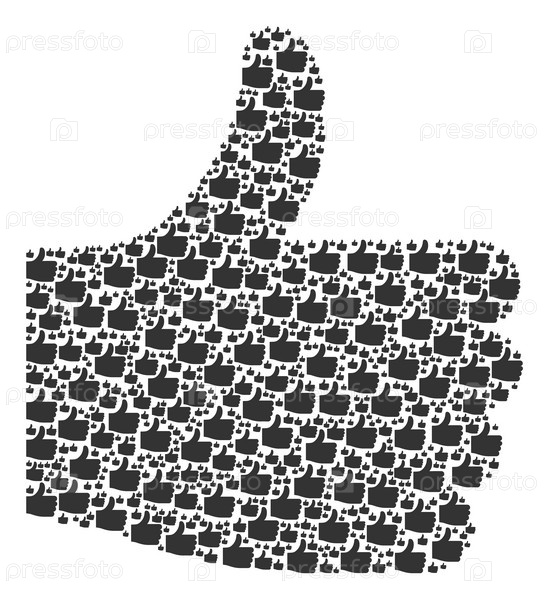 Мозаика опроса, созданная из икон с поднятием пальца в разных размерах. Абстрактная векторная концепция поднятия пальца. Иконы поднятия пальца организованы в форму ОК