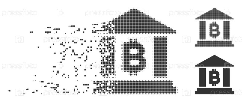 Растворенный биткойн-банк создает пиксельный иконку с эффектом дезинтеграции.Включены половинчатые пунктирные и не поврежденные целые серые версии