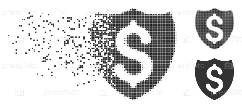 Растворенный финансовый щит пунктированная икона с эффектом дезинтеграции. полутонные пунктирные и нетронутые целые серые варианты включены