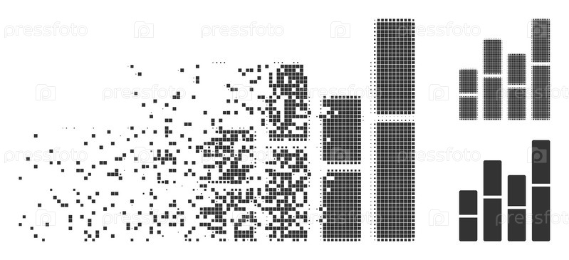 Растворенные штрих-графики пиксельные иконы с эффектом дезинтеграции. Полутоновые пунктирные и нетронутые целые серые версии. Пункты имеют квадратную форму. Точки объединяются в фигуру рассредоточенных штрих-графиков