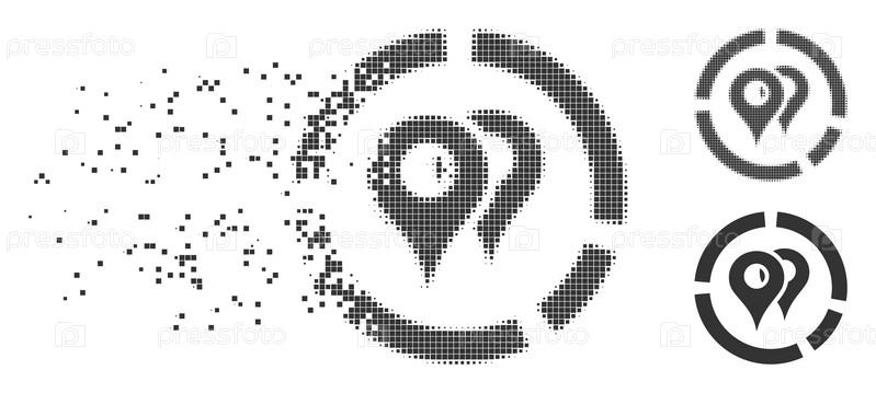 Fractured geo diagram dotted icon with disintegration effect. Полутон пикселированный и не поврежденные целые варианты серого цвета. Точки имеют квадратную форму. Частицы составлены в виде рассредоточенной геодиаграммы