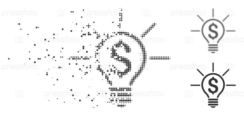Расколотая финансовая идея лампочка пунктирный иконка с эффектом дезинтеграции. полутон пикселированные и не поврежденные твердосерые версии. точки имеют форму прямоугольника