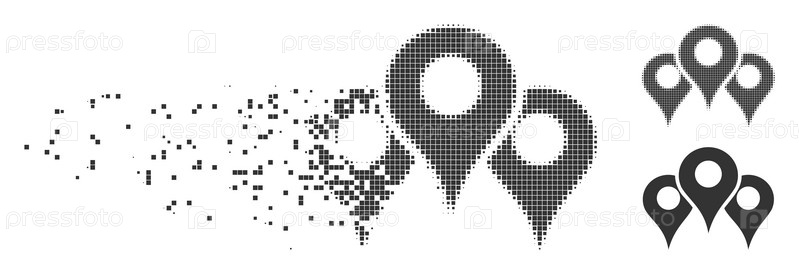 Растворенные локации карты пунктирный значок с эффектом дезинтеграции. Полутон пикселированных и нетронутых целых серых вариантов. Точки имеют форму прямоугольника. Элементы расположены в рассредоточенной форме местоположений карты