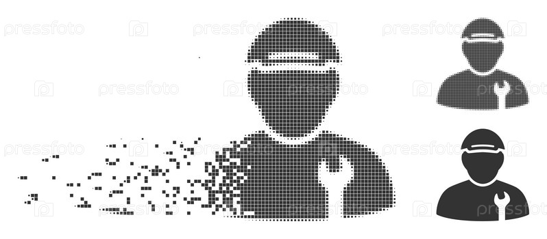 Растворенный механический точечный значок с эффектом дезинтеграции. Полутонные пикселированные и нетронутые твердые серые варианты. Точки имеют квадратную форму. Элементы группируются в исчезающую механическую форму