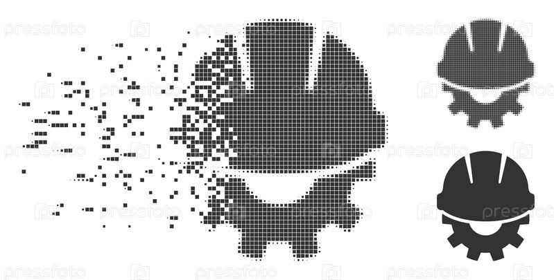 Икона рассеянного пикселя развития с эффектом дезинтеграции. полупикселированные и не поврежденные версии твердого серого цвета. точки имеют прямоугольную форму