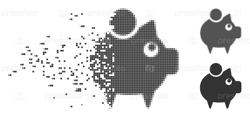 Дисперсированный пиксельный икон с эффектом дезинтеграции. Полутонные пунктирные и нетронутые варианты твердого серого цвета. Точки имеют форму прямоугольника. Пиксели организованы в растворяющуюся форму свиного сада