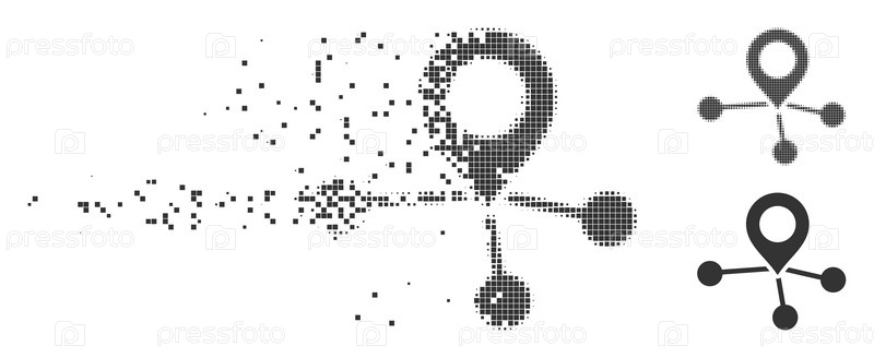 Пиксельная икона с дезинтеграционным эффектом переломных точек. Полутонные пунктирные и нетронутые целые варианты серого цвета. Точки имеют прямоугольную форму. Частицы составлены в форме рассредоточенных мест
