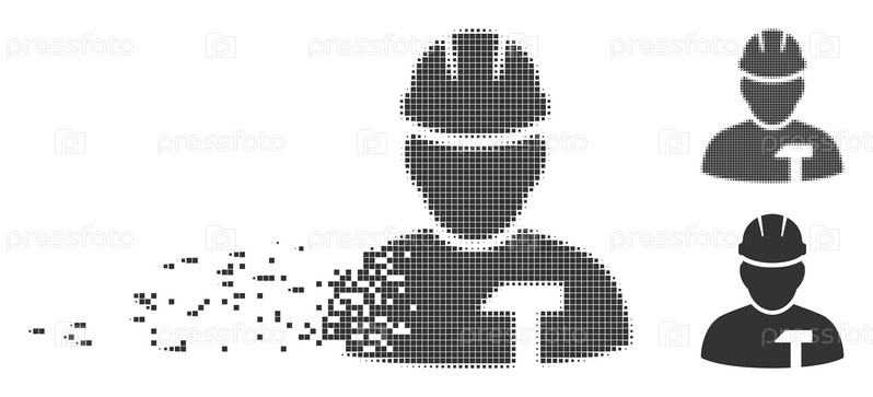 Fractured builder person dotted icon with disintegration effect. Полутонные пикселированные и неповрежденные твердосерые версии. Точки имеют прямоугольную форму