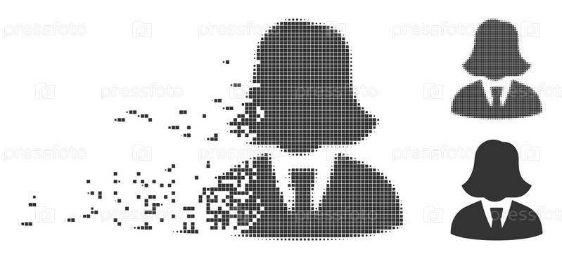 Растворенная бизнес-леди пунктирный значок с эффектом дезинтеграции. полутон пикселированные и нетронутые целые варианты серого цвета. точки имеют форму прямоугольника