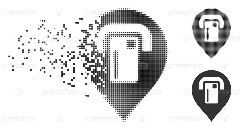 Расколотая карта банкомата с иконой указателя пикселя с эффектом дезинтеграции. полупикселированный цвет и не поврежденные варианты целого серого цвета. точки имеют квадратную форму