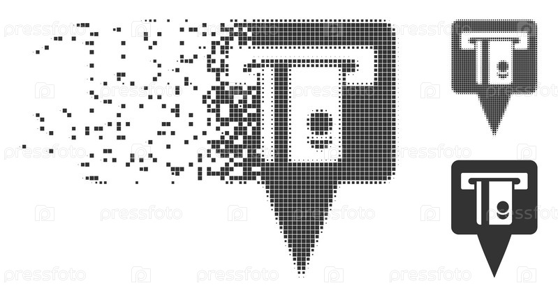 Растворенный маркер терминала банкомата иконка пикселя с эффектом дезинтеграции. полупикселированные и не поврежденные версии целого серого цвета. точки имеют квадратную форму