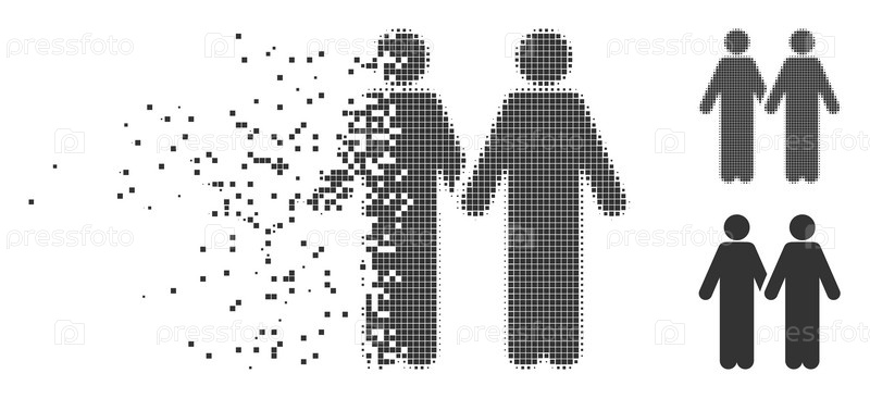 Разбитые взрослые друзья пунктирная икона с эффектом дезинтеграции. Полутон пикселированный и не поврежденные целый серый варианты. точки имеют форму прямоугольника