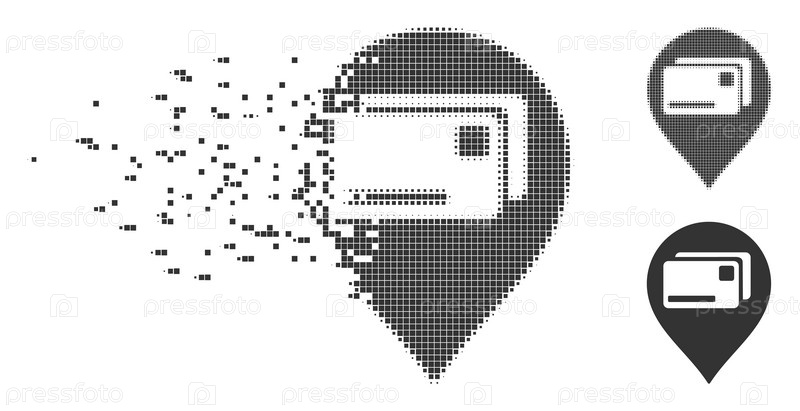 Фрактурированные банковские карты с иконой указателя пикселя с эффектом дезинтеграции. Полутонно-пикселеризованный и неповрежденный твердосерый варианты. Точки имеют прямоугольную форму