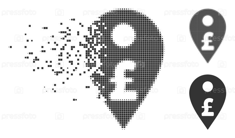 Растворенный маркер карты фунта пунктирная икона с эффектом дезинтеграции. Полутон пикселированные и нетронутые целые серые версии. точки имеют квадратную форму