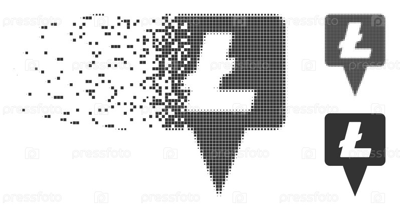 Dissolved Litecoin map pointer dotted icon with disintegration effect. полуточечная пунктирная и неповрежденные твердосерая версии. точки имеют прямоугольную форму