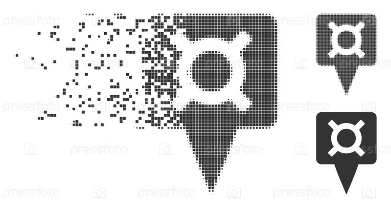 Дисперсированная валюта карта указатель пунктирный иконка с эффектом дезинтеграции. полутоневые пунктирные и нетронутые целые серые варианты. точки имеют квадратную форму