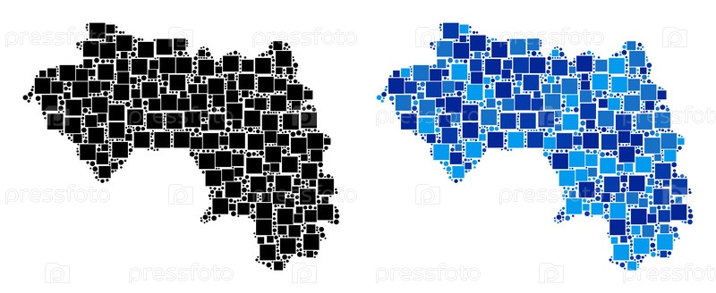 Абстрактный географический вариант карты, выполненный с холодными синими оттенками цвета. Векторный коллаж карты Африканской Гвинеи построен из рандомизированных прямоугольников и круглых частей