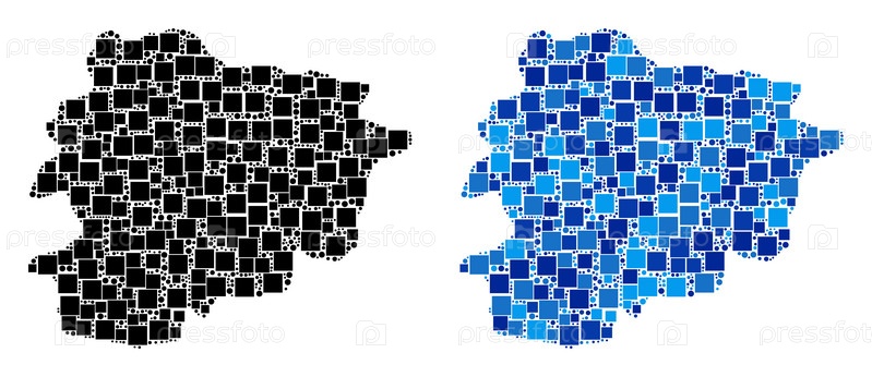 Абстрактный вариант географической карты, выполненный с холодными синими оттенками цвета. Векторная мозаика карты Андорры построена из случайных квадратных и сферических точек