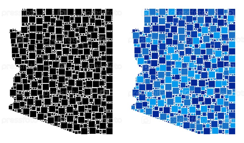 Окрашенные варианты карты штата Аризона. Абстрактный географический вариант карты, разработанный с синими оттенками цвета. Векторная композиция карты штата Аризона, созданной из случайных квадратных и сферических точек