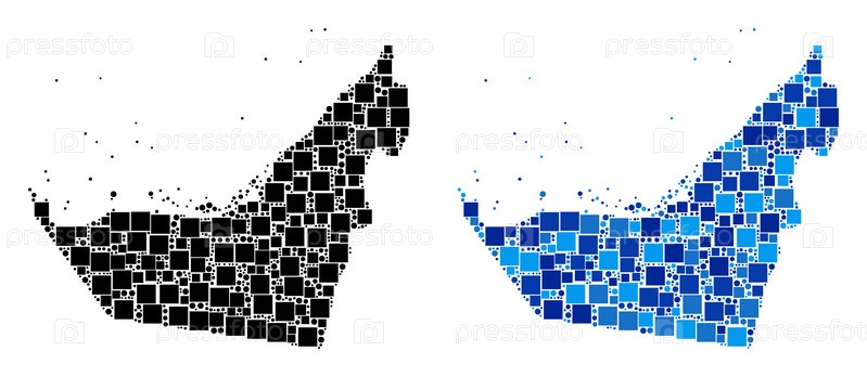 Варианты карты Арабских Эмиратов с точками. Абстрактный вариант географической схемы выполнен с помощью синих оттенков цвета. Векторный коллаж карты Арабских Эмиратов, выполненный с рассеянными элементами прямоугольника и круга