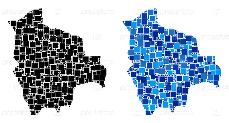 Версии карты Боливии с точками. Абстрактная версия географической карты, выполненной в синих оттенках цвета. Векторный коллаж карты Боливии, образованный из рандомизированных элементов прямоугольника и круга