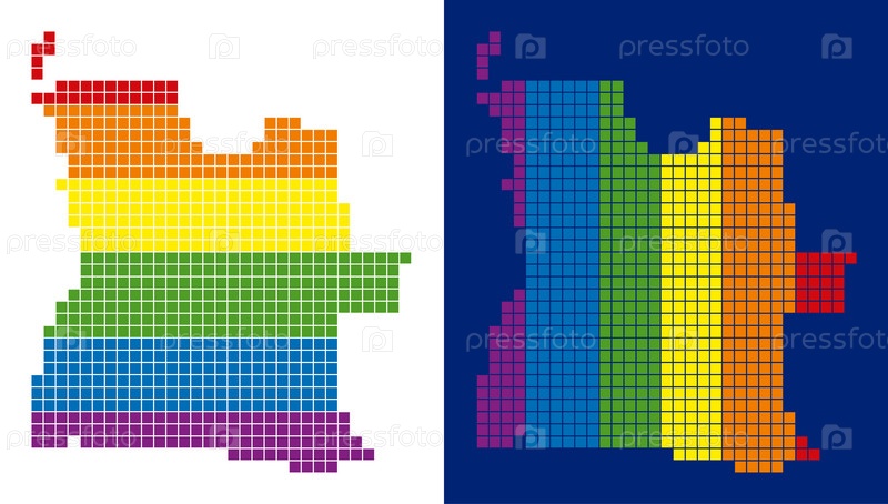 Векторные географические карты в цветах флага ЛГБТ с вертикальными и горизонтальными направлениями на белом и синем фоне. Цветная абстрактная концепция карты Анголы, состоящая из точек
