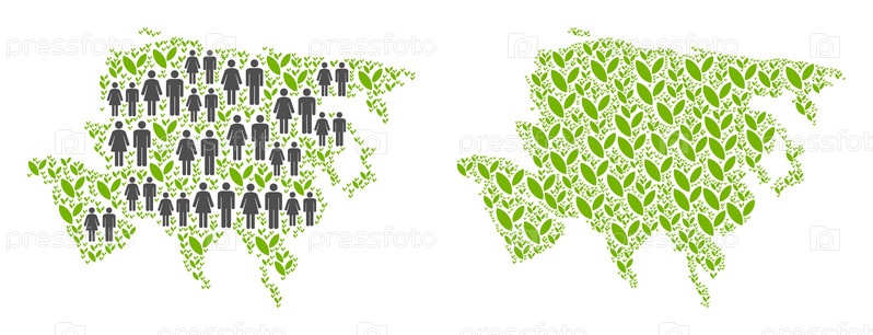 Люди население и окружающая среда Карта Азии. Векторная мозаика карты Азии, организованной из случайных мужчин и женщин и цветочных предметов различного размера. Абстрактное социальное представление национальной массовой картографии