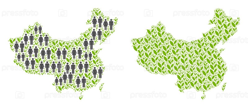 Население и эко Китайская карта. Векторный шаблон карты Китая в сочетании с разбросанными мужчинами и женщинами и предметами травы различных размеров. Абстрактный социальный план национальной групповой картографии
