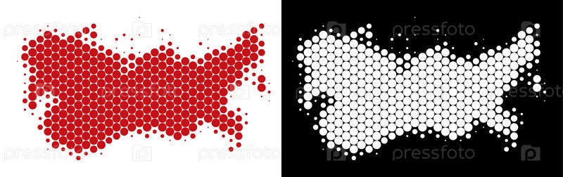 Карта СССР с пунктирными полутоннами. Векторная географическая схема на белом и черном фоне. Абстрактный коллаж карты СССР, созданной со сферическими точками