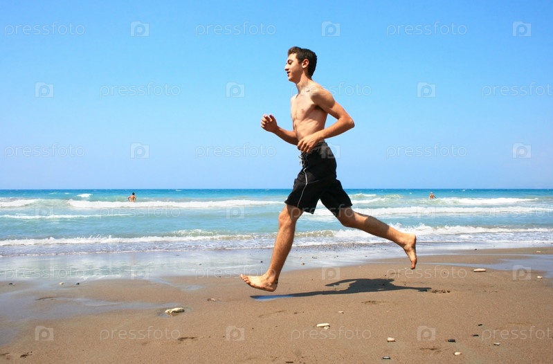 Бегущий молодой человек по пляжу