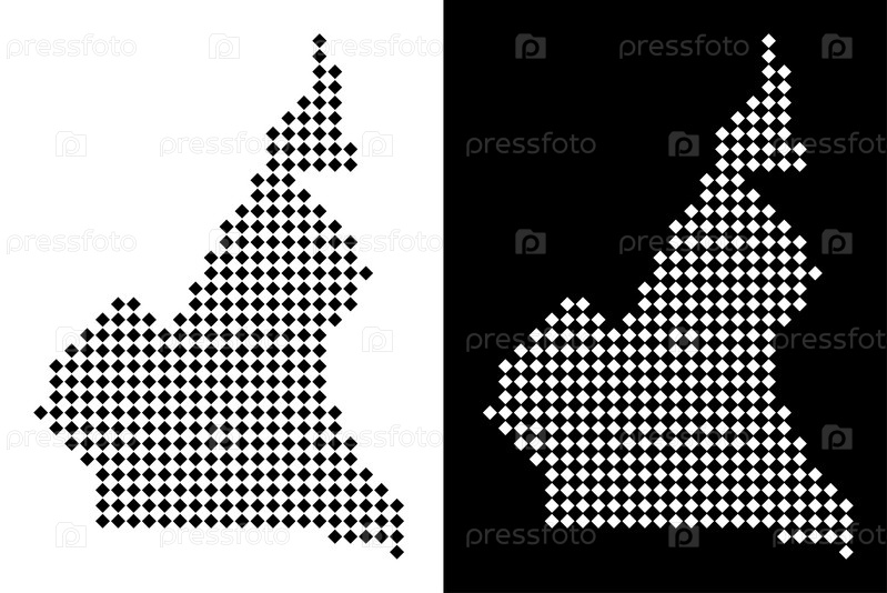 Векторная карта Африканского Камеруна с пунктирным ромбом. Абстрактные территориальные карты в черно-белых цветах на белом и чёрном фоне. Карта Африканского Камеруна, организованная из рисунка пунктов ромба