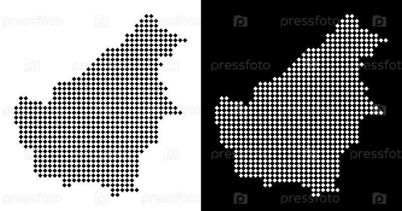 Карта острова Борнео с векторными ромбическими точками. Абстрактные карты территорий в черно-белых цветах на белом и чёрном фоне. Карта острова Борнео, построенная из ромбовой точечной сетки