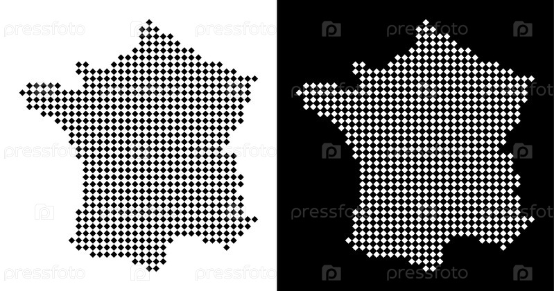 Векторный ромб пиксель Франция карта. Абстрактные географические карты в черно-белых цветах на белом и чёрном фоне. Карта Франции, состоящая из решетки с ромбическими точками