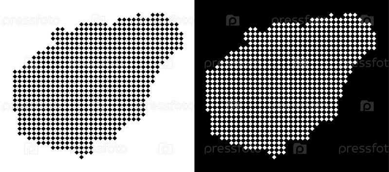 Векторная ромбическая пиксельная карта острова Хайнань. Абстрактные территориальные карты в черно-белых цветах на белом и чёрном фоне. Карта острова Хайнань, комбинированная с ромбической сеткой небольших предметов