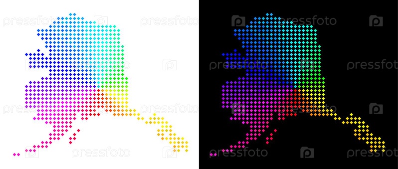 Карта Аляски с точками спектра.Векторная карта территории в ярких цветах радуги с круговым градиентом на белом и черном фоне.Точки имеют форму ромба