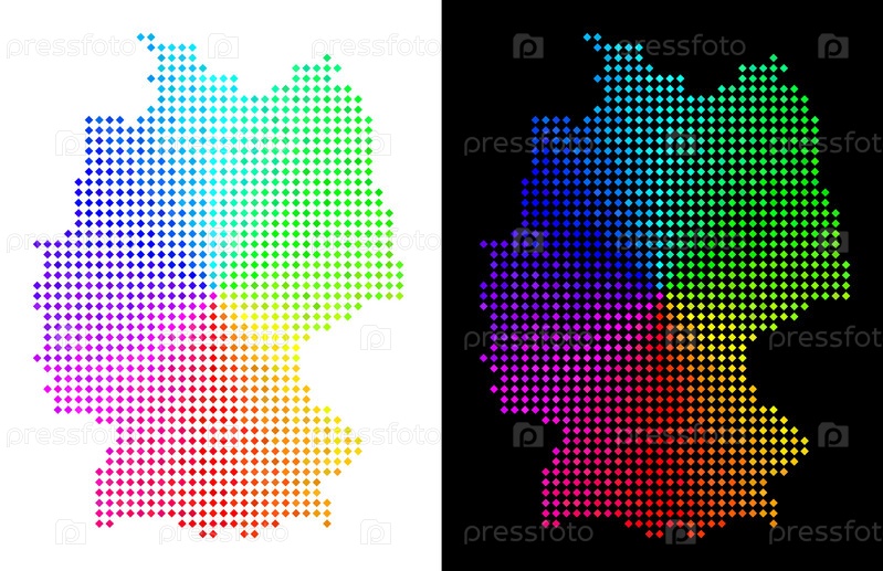 Карта Германии с точки радуги. Векторный план территории в ярких спектральных цветах с круговым градиентом на белом и черном фоне. Пиксели имеют ромбическую форму