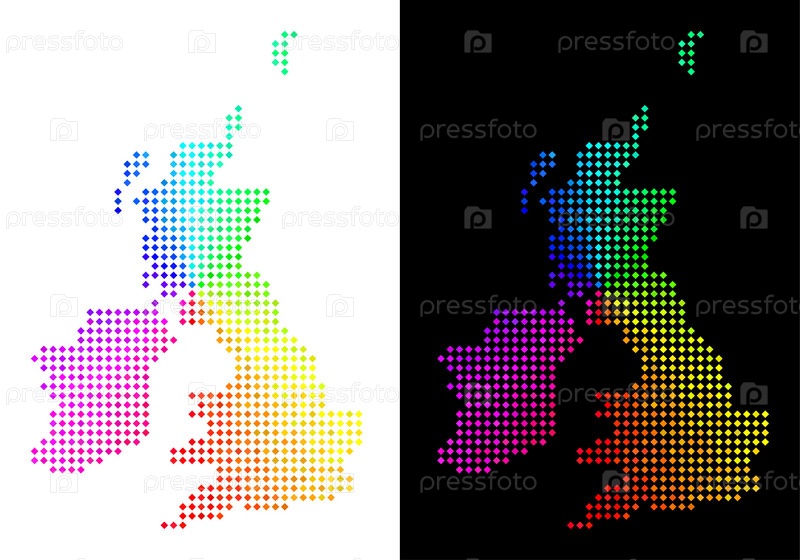 Цветная пунктирная карта Великобритании и Ирландии. Векторный территориальный план в ярких цветах радуги с круговым градиентом на белом и черном фоне