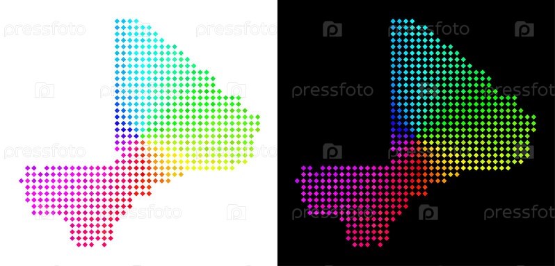 Спектр точка Мали карта. векторная географическая карта в ярких цветах радуги с круговым градиентом на белом и черном фоне. точки имеют ромбическую форму