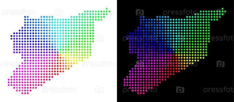 Векторальный географический план в ярких цветах радуги с круговым градиентом на белом и черном фоне Пиксели имеют ромбическую форму