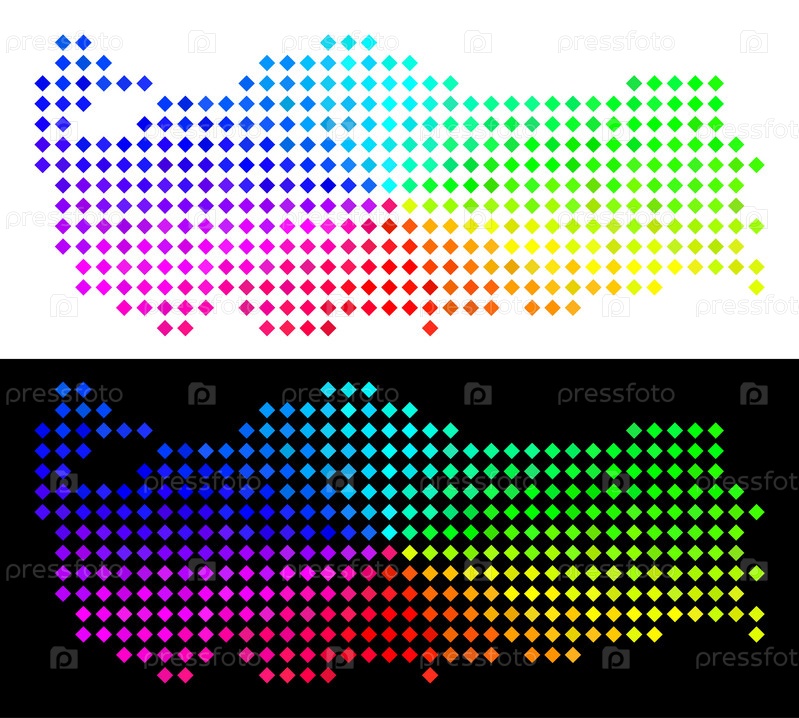 Карта спектральных точек Турции. векторная карта территории в ярких спектровых цветах с круглым градиентом на белом и черном фоне. точки имеют ромбическую форму