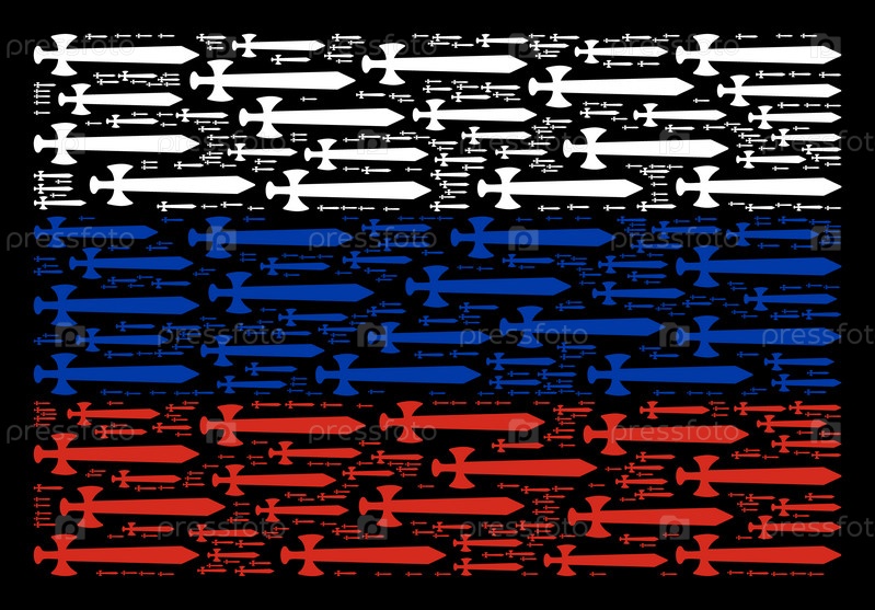 Векторные элементы дизайна средневекового меча составлены в мозаичный коллаж российского флага