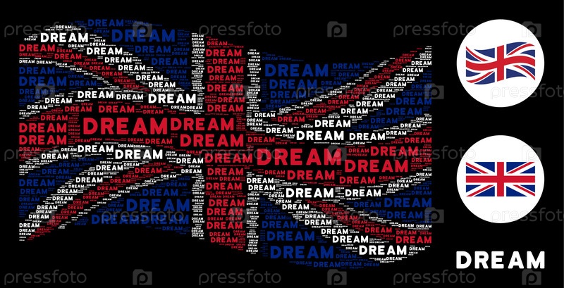 Векторальные элементы слов снов объединены в концептуальную иллюстрацию флага Соединенного Королевства
