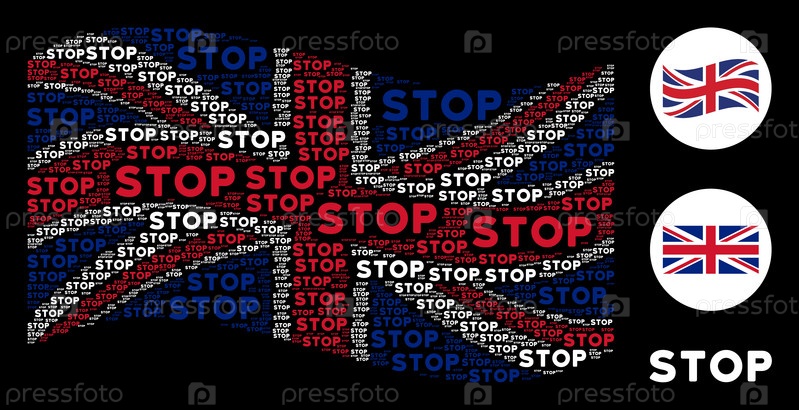 Векторные текстовые элементы STOP формируются в концептуальную композицию флага Великобритании