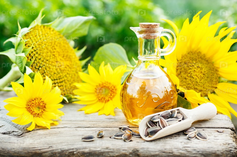 Подсолнечное масло с семенами на старом деревянном столе