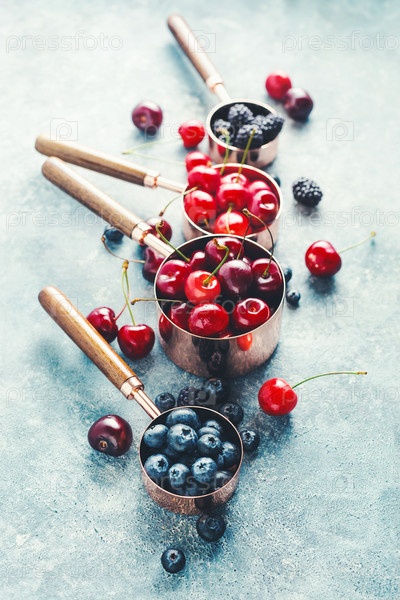 Различные ягоды в медных мерных чашках, черники, вишни и голуби