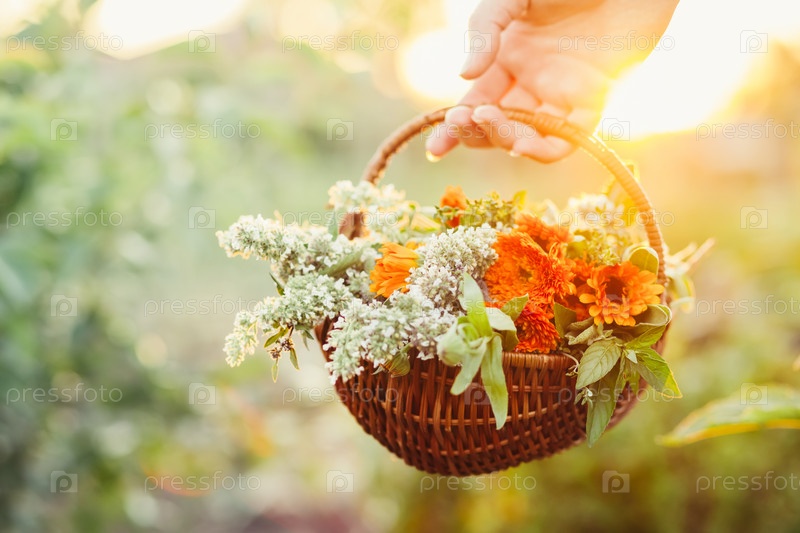 Рука женщины, держащей корзину с цветами из сада